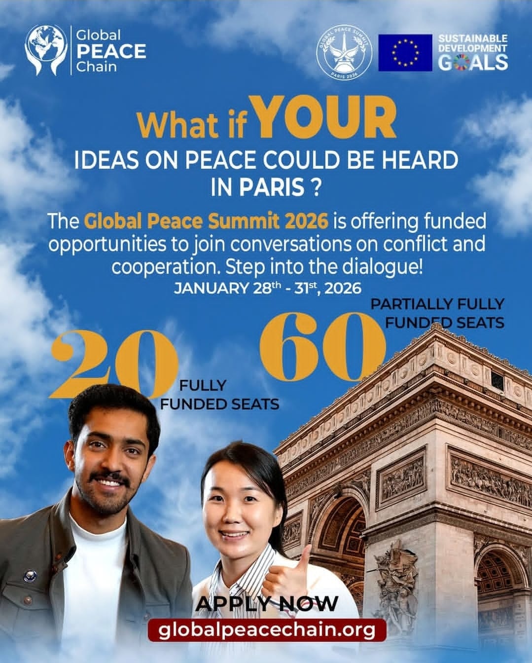 ๐โจ Global Peace Summit โ Paris 2026 ๐ซ๐ท โจ๐ Be part of a transformative journey in the City of Lights! From 28โ31 January 2026, the Global Peace Summit will unite young changemakers to strengthen leadership, foster dialogue, and work for a peaceful world. ๐๏ธ ๐ Funding Opportunities: โ 20 Fully Funded Seats โ airfare, accommodation & program fees โ 60 Partially Funded Seats โ accommodation & program fees ๐ Deadline: 30 October 2025 Donโt miss your chance to shine on the global stage โ apply now! ๐
